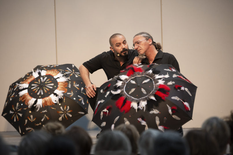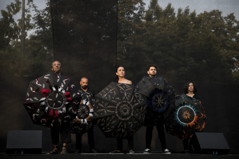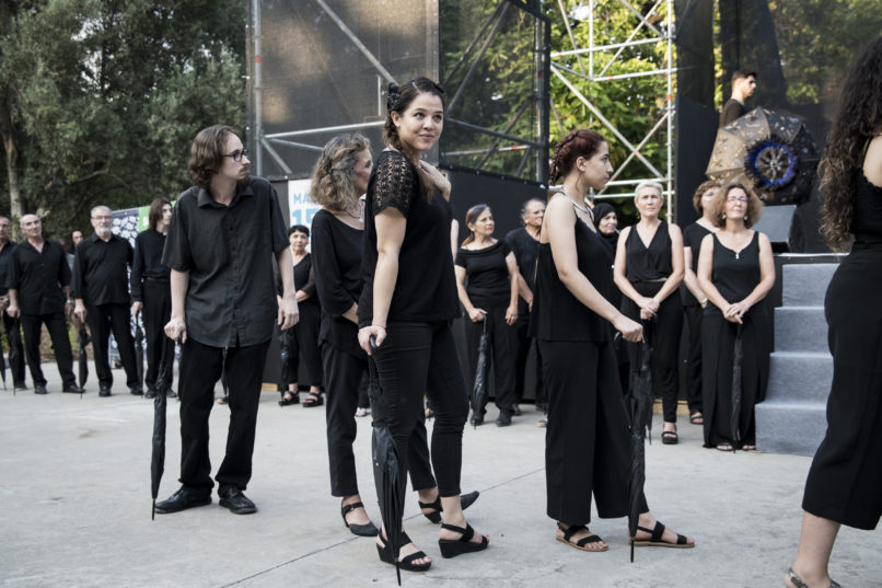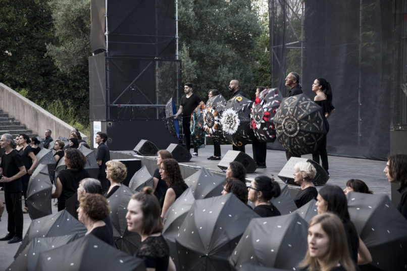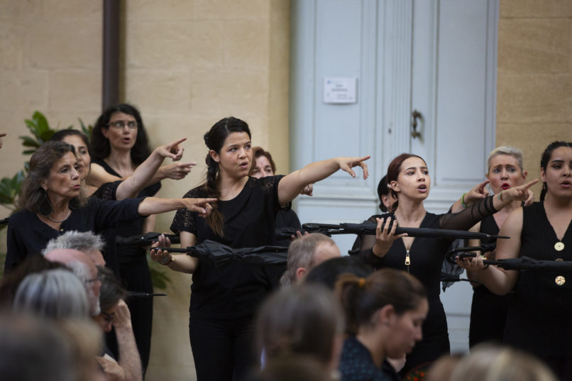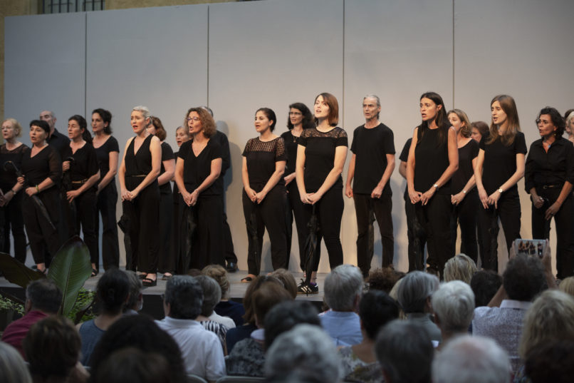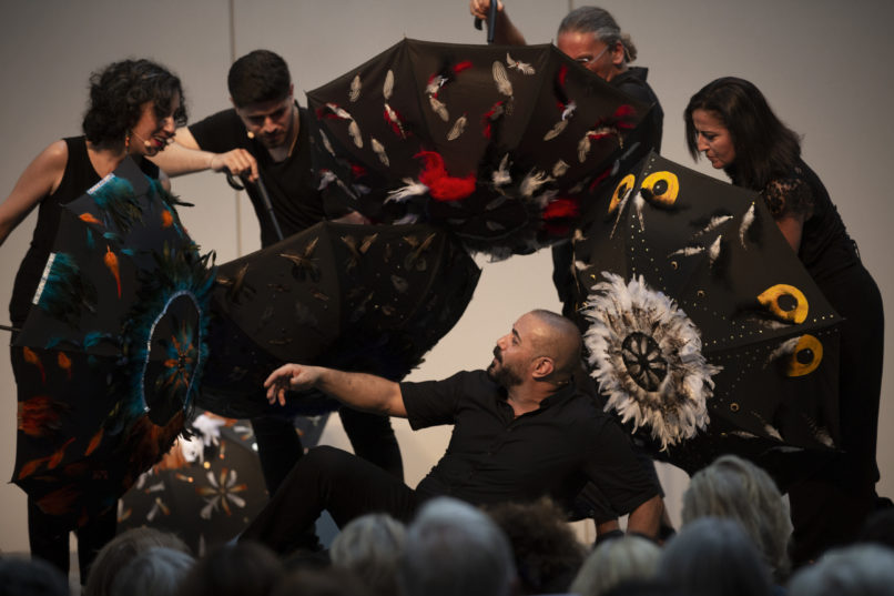 L’allégorie d’oiseaux en proie à des questions métaphysiques, imaginée par le poète persan Farid al-Din’Attar au XIIe siècle n’a cessé de fasciner ses lecteurs par sa richesse d’évocation. En faisant le pari de transposer cette « harmonie céleste » pour la scène, Moneim Adwan et Victoria Duhamel créent un espace de rencontres : la relecture d’un texte séculaire, emblématique de la spiritualité soufi, par l’auteur contemporain Fady Jomar ; l’entrelacement de deux langues, l’arabe et le français, pour raconter le périple des oiseaux, explorer les motifs de leur quête et son inscription dans le monde ; la balance des styles, entre musique orientale et occidentale, chantées a capella. Enfin la collaboration du chœur multiculturel Ibn Zaydoun et du groupe vocal Antequiem pour donner corps à ce spectacle pensé pour le plein air.