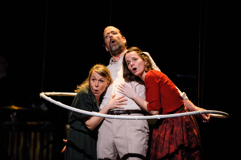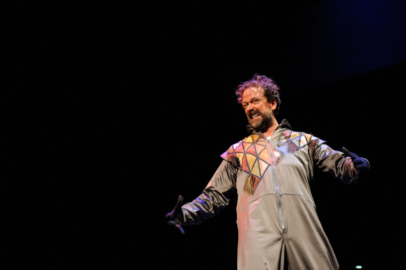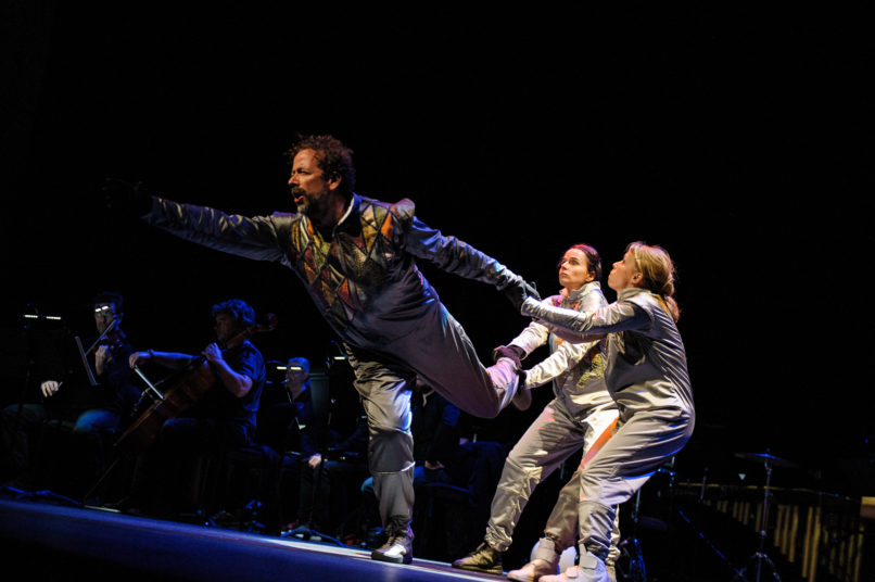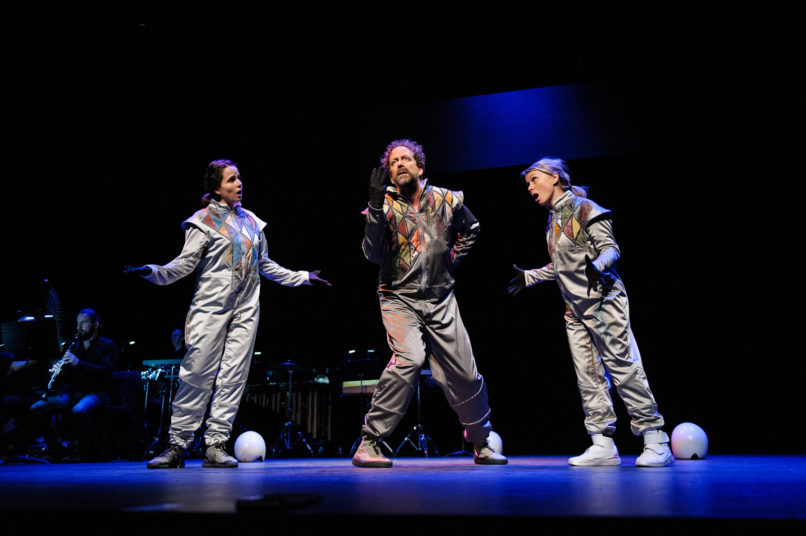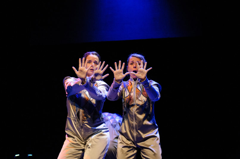 En s’emparant du recueil Le Cosmicomiche, écrit par Italo Calvino, Michèle Reverdy a composé un triptyque : la première partie nous plonge en un temps où rien n’existe, mais où tout émerge, lorsque le narrateur fait un signe dans l’espace. La parabole est riche : qu’est-ce qu’un geste créateur ? Comment les signes structurent-ils notre rapport au réel ? Existons-nous en dehors du langage ? Vastes sujets que nous aborderons gaiment – après tout, nous évoluons dans un monde sans « gravité », comme le rappellent les costumes des trois protagonistes, mi-cosmonautes, mi-Arlequins.